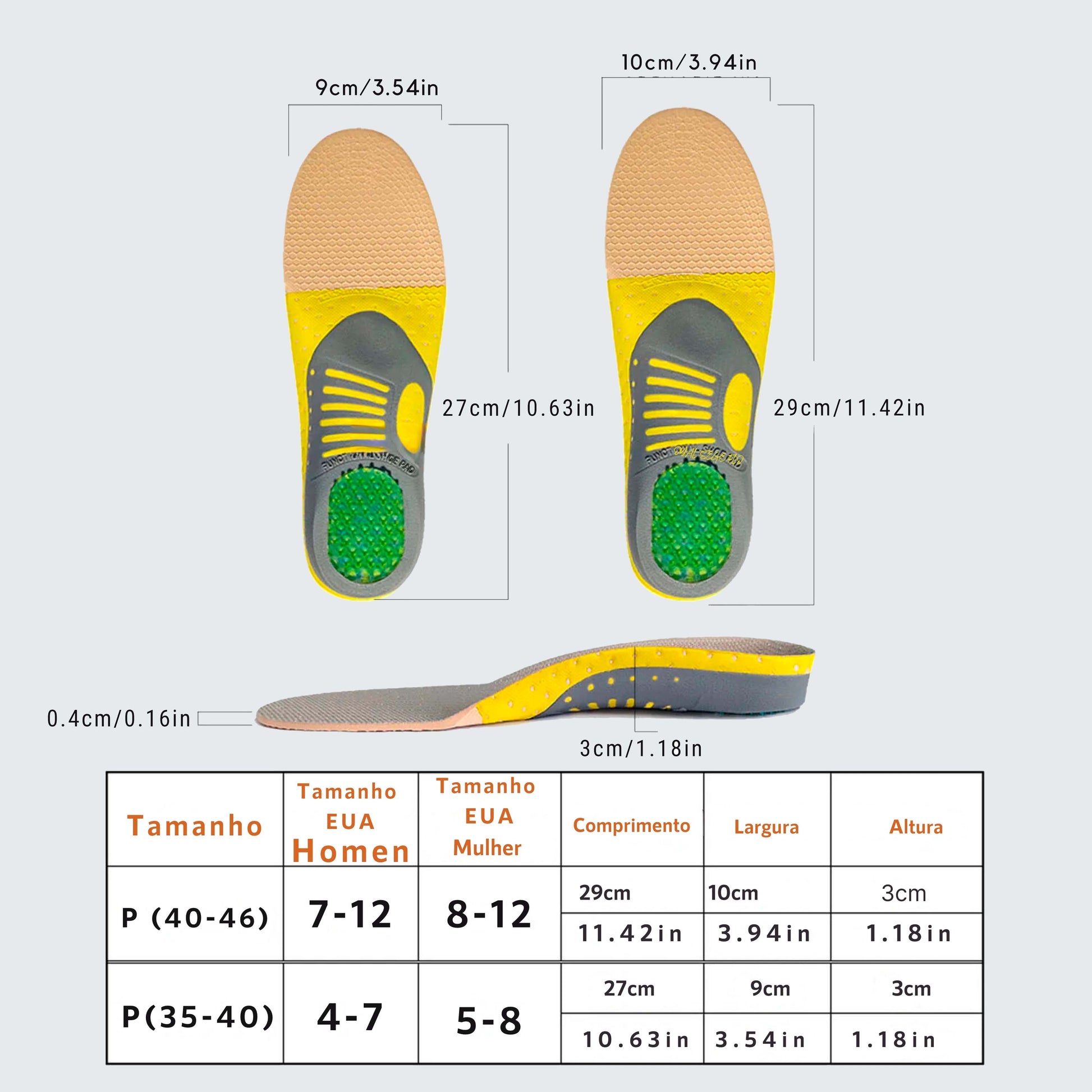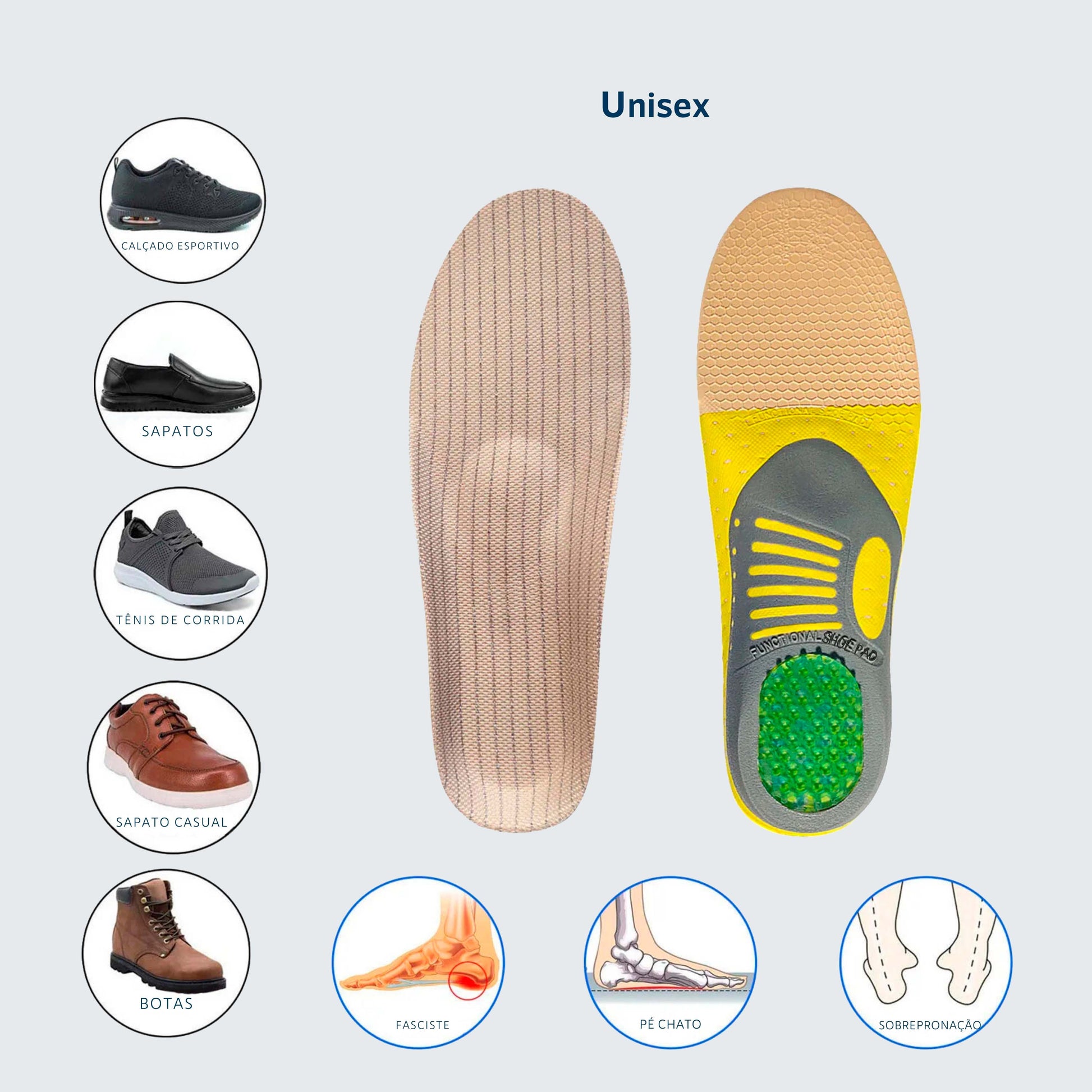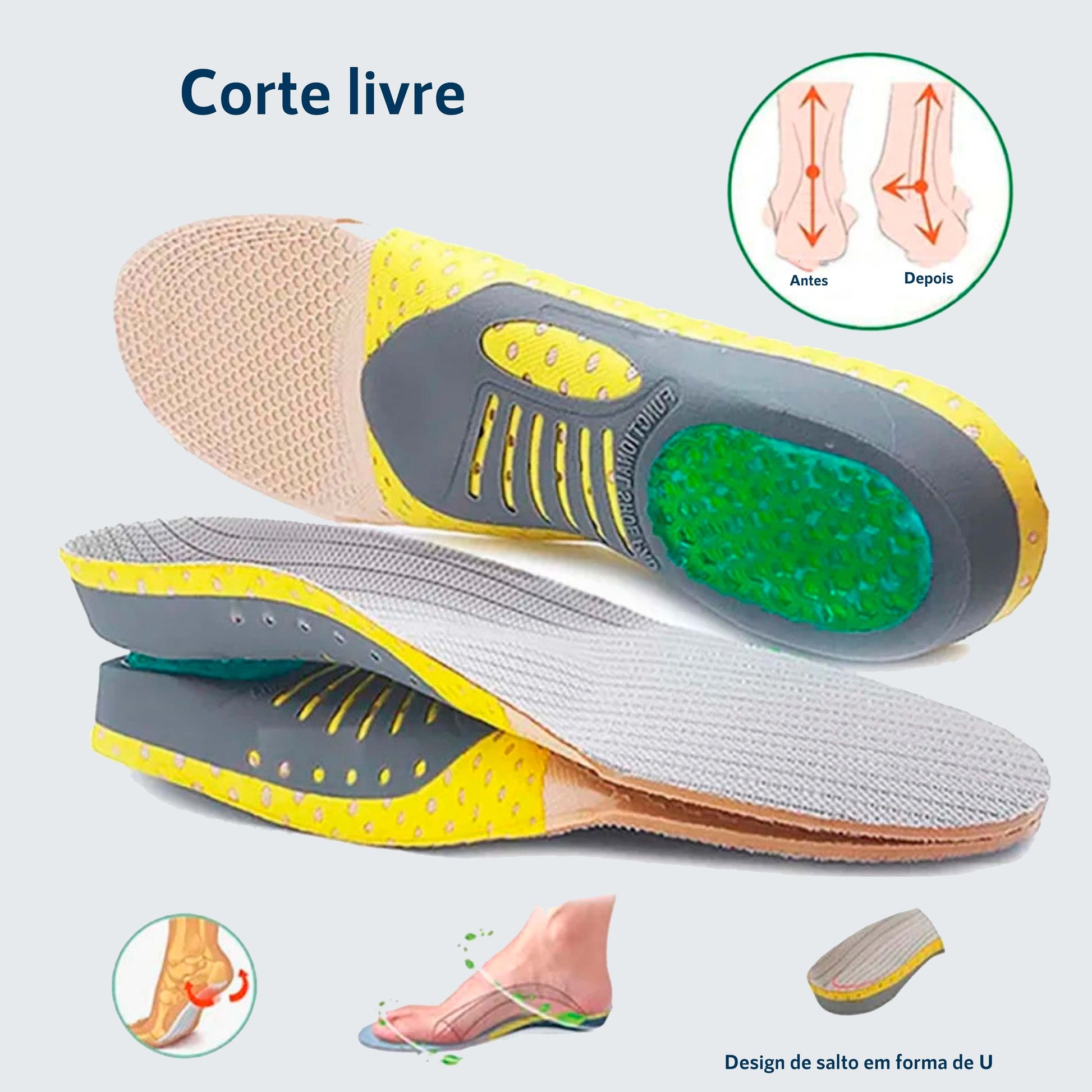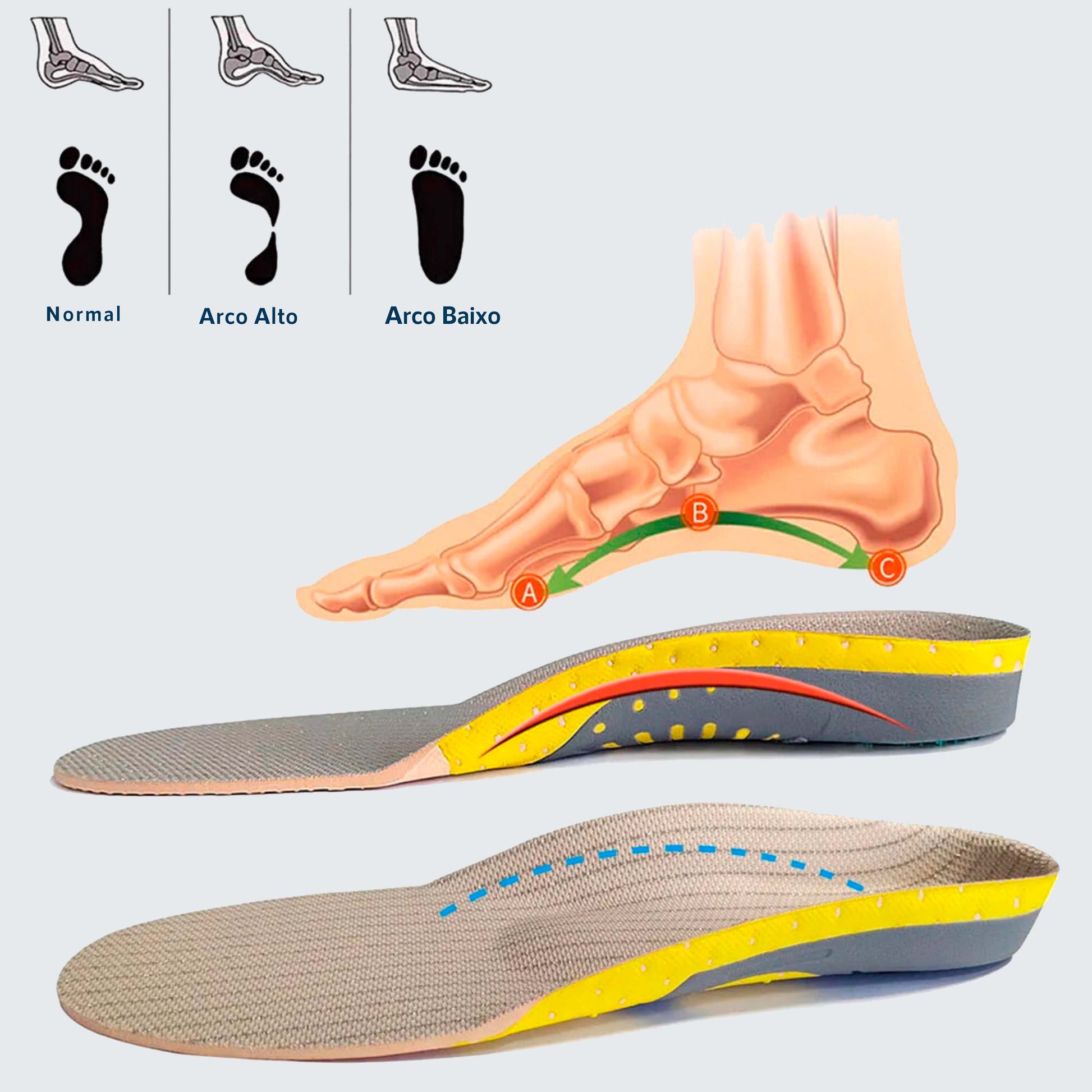 Alívio para Problemas de Pé: Projetada para aliviar dores como pé chato, pé caído, fascite plantar e outros problemas comuns nos pés, esta palmilha proporciona um alívio imediato e duradouro da dor, permitindo que você desfrute de uma caminhada mais confortável.